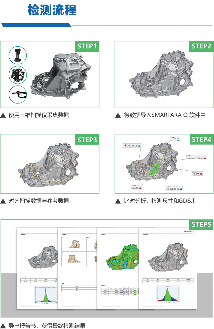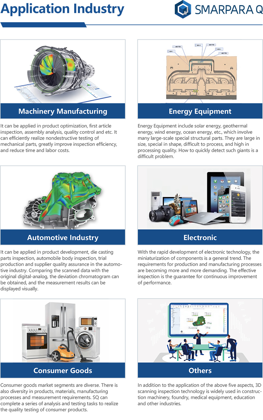 SMARPARA Q is a powerful computer-aided 3D quality control software that embeds a large number of standardized tools required by the industry. Based on the underlying high-precision algorithm and simple workflow, SMARPARA Q performs accurate and fast inspection tasks for parts with complex shapes and numerous features, providing high-precision, high-efficiency, high-reliability, and high-performance products for all-round quality control. Intelligent industrial-grade professional detection software tools.