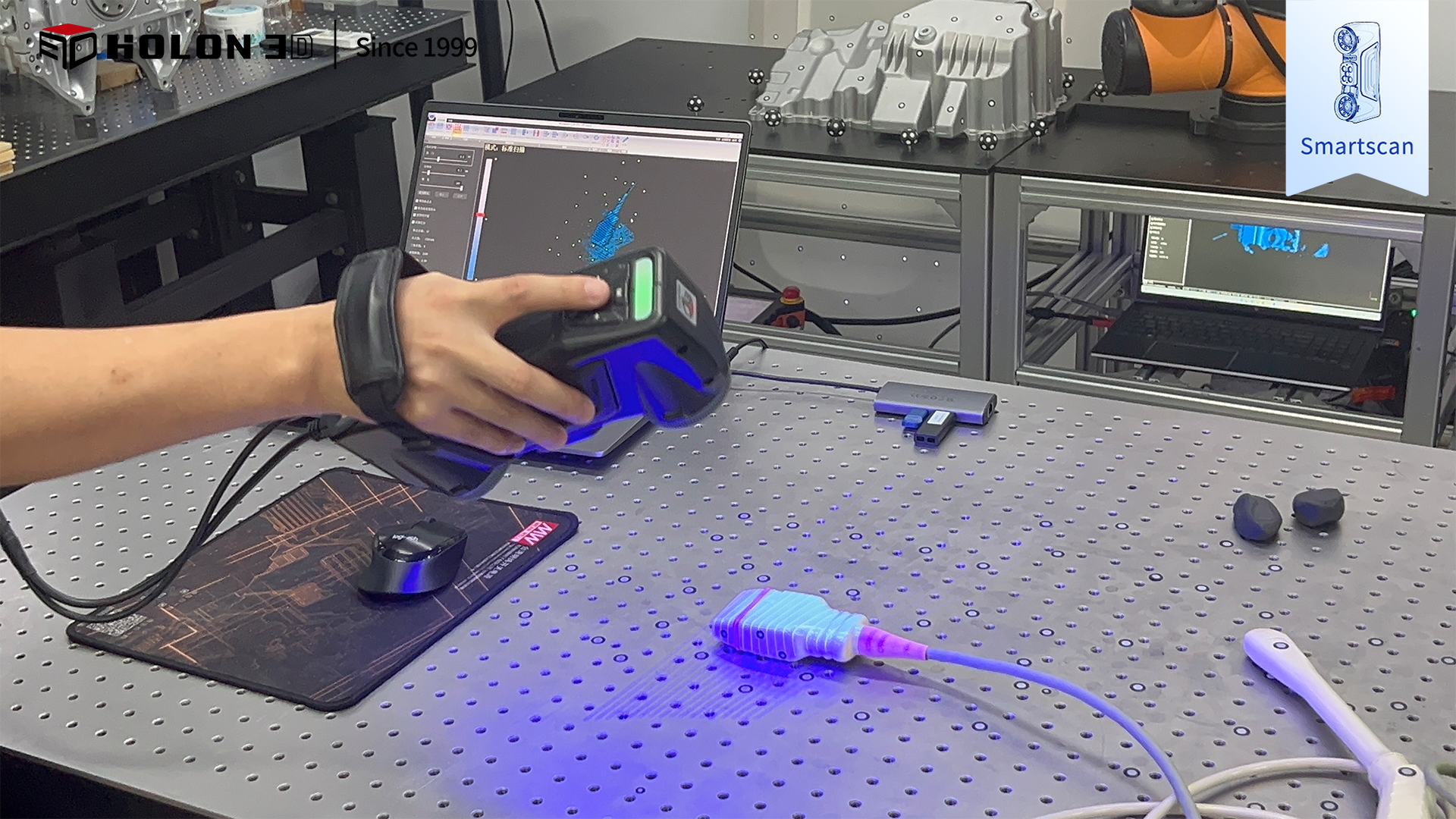 B 超探測(cè)儀器作為醫(yī)療診斷的關(guān)鍵設(shè)備,其結(jié)構(gòu)精度直接影響檢測(cè)準(zhǔn)確性與操作便捷性。客戶需對(duì)該儀器進(jìn)行三維數(shù)據(jù)采集,通過與原始數(shù)模對(duì)比開展三維檢測(cè),或用于后續(xù)的優(yōu)化設(shè)計(jì)。由于儀器對(duì)掃描速度與精度要求極高,傳統(tǒng)測(cè)量方式難以滿足需求,因此選擇 HOLON 3D Smart 49 手持式三維掃描儀,為設(shè)備質(zhì)量管控與性能升級(jí)提供精準(zhǔn)數(shù)據(jù)支撐。