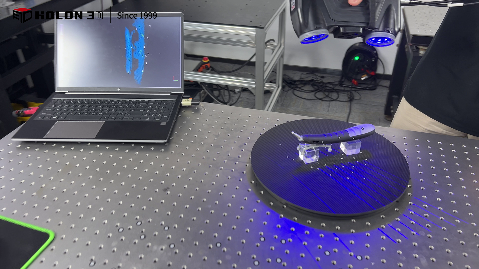 神經(jīng)系統(tǒng)導(dǎo)航儀作為精準(zhǔn)醫(yī)療設(shè)備的核心部件,其結(jié)構(gòu)精度直接關(guān)系到手術(shù)導(dǎo)航的準(zhǔn)確性與安全性。客戶需對該導(dǎo)航儀進(jìn)行三維數(shù)據(jù)采集,通過與原始數(shù)模的三維檢測與對比,量化加工誤差,以此把控產(chǎn)品質(zhì)量。由于導(dǎo)航儀表面特征細(xì)微,且客戶對掃描精度有極高要求,傳統(tǒng)測量方式難以滿足需求,因此選擇 HOLON 3D smart 49 手持式全藍(lán)激光三維掃描儀,為設(shè)備的質(zhì)量檢測提供精準(zhǔn)數(shù)據(jù)支撐。