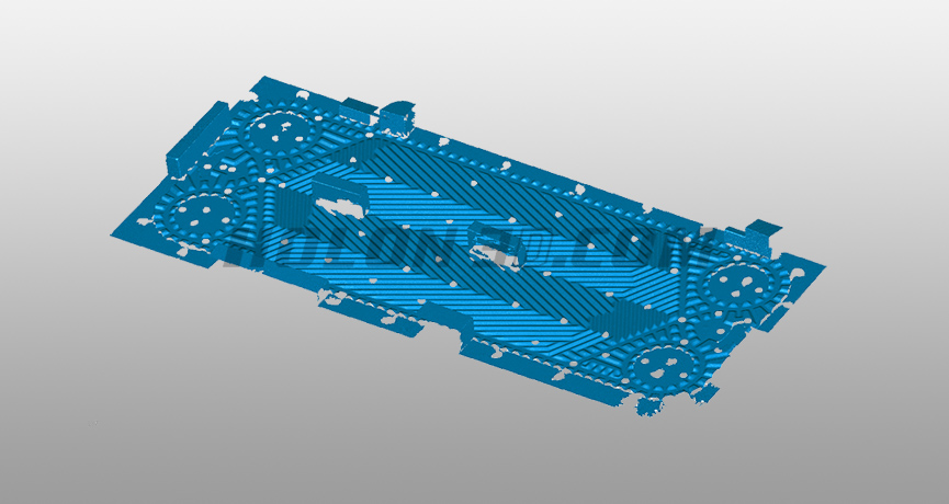 利用先進三維測量技術對換熱板進行掃描,快速獲取換熱板高精度三維數據,精密模式對表面難以測量的凹槽進行數據補充。手持式三維掃描儀Model 37整體用時8分鐘,精度0.02mm,高精度三維數據為后續(xù)檢測提供穩(wěn)定數據支撐,加快了換熱板檢測進度、減少時間成本。