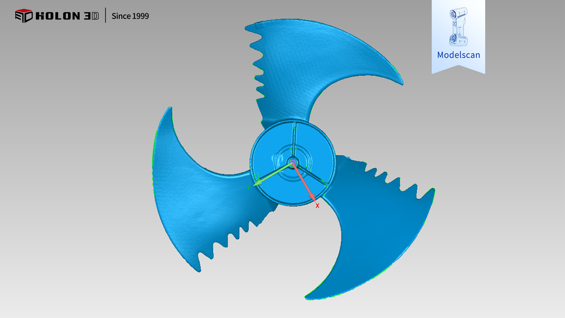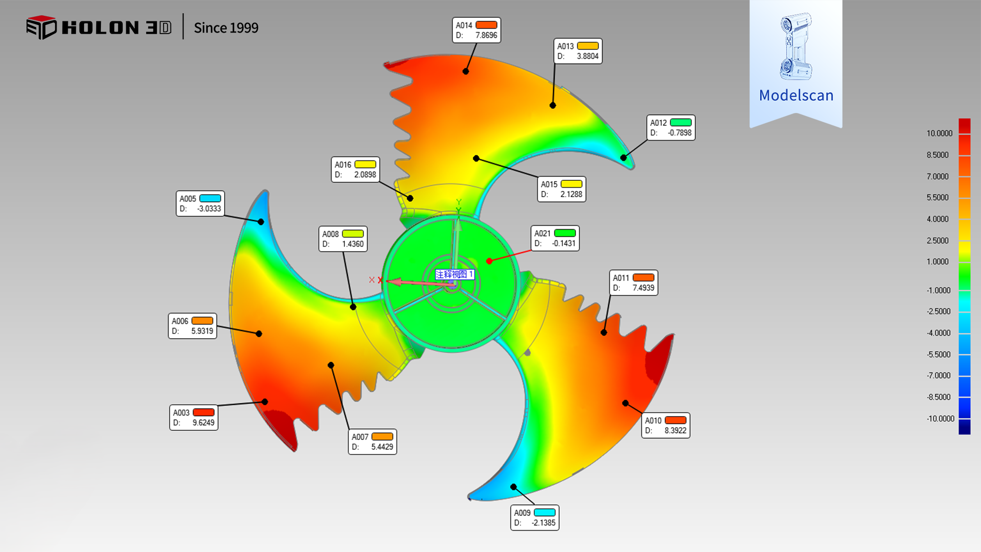 HOLON 3D采用高精度三維掃描儀Model 49,3分鐘內(nèi)完成葉片全尺寸0.02mm精度建模,精準(zhǔn)捕獲彎扭氣動曲面及微米級缺陷?;趻呙钄?shù)據(jù)生成質(zhì)量分布云圖,通過軟件對比分析實現(xiàn)動態(tài)平衡,使得設(shè)備壽命延長2倍。幫助客戶通過智能優(yōu)化氣動布局與材料分布,降低能耗與振動,同步實現(xiàn)減重增效,助力客戶突破性能與成本瓶頸。