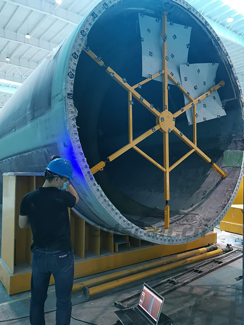 由于葉片體積大(長(zhǎng)約80米,直徑約3米多),不便移動(dòng),依靠人工傳統(tǒng)的測(cè)量方式,效率低,精度達(dá)不到要求,做不到精準(zhǔn)檢測(cè)。因此采用三維掃描檢測(cè)。