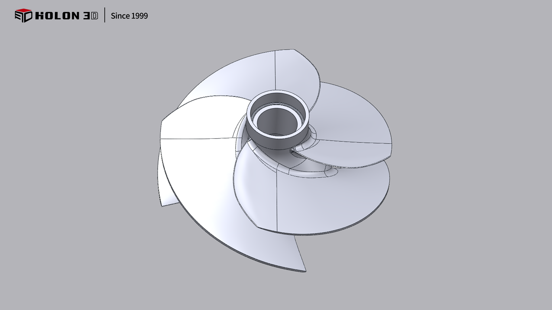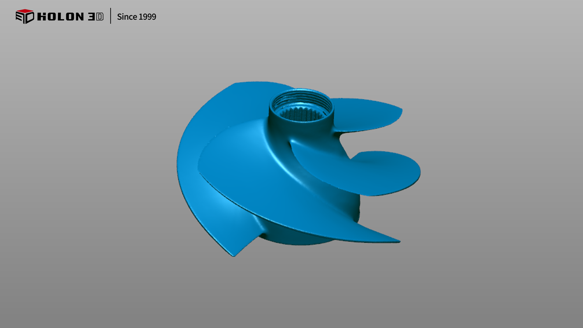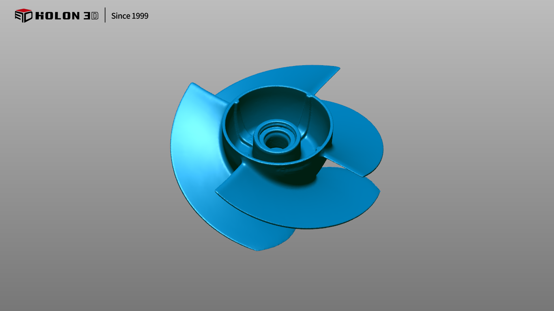 葉輪螺旋槳是摩托艇的核心動力部件,其葉片弧度、尺寸精度與整體結(jié)構(gòu)完整性直接決定航行速度與動力效率??蛻粜鑼υ撃ν型~輪螺旋槳進(jìn)行三維掃描,獲取精準(zhǔn)完整的三維數(shù)據(jù)以開展逆向建模,為產(chǎn)品復(fù)刻、性能優(yōu)化或備件生產(chǎn)提供可靠依據(jù)。由于螺旋槳表面存在反光特性,且葉片部位較薄,客戶對掃描精度與工件數(shù)據(jù)完整性要求極高,傳統(tǒng)測量方式難以滿足需求,因此選擇 HOLON 3D Smart 49 手持式全藍(lán)激光工業(yè)級三維掃描儀,為螺旋槳的數(shù)字化逆向建模提供高效精準(zhǔn)的技術(shù)支撐。