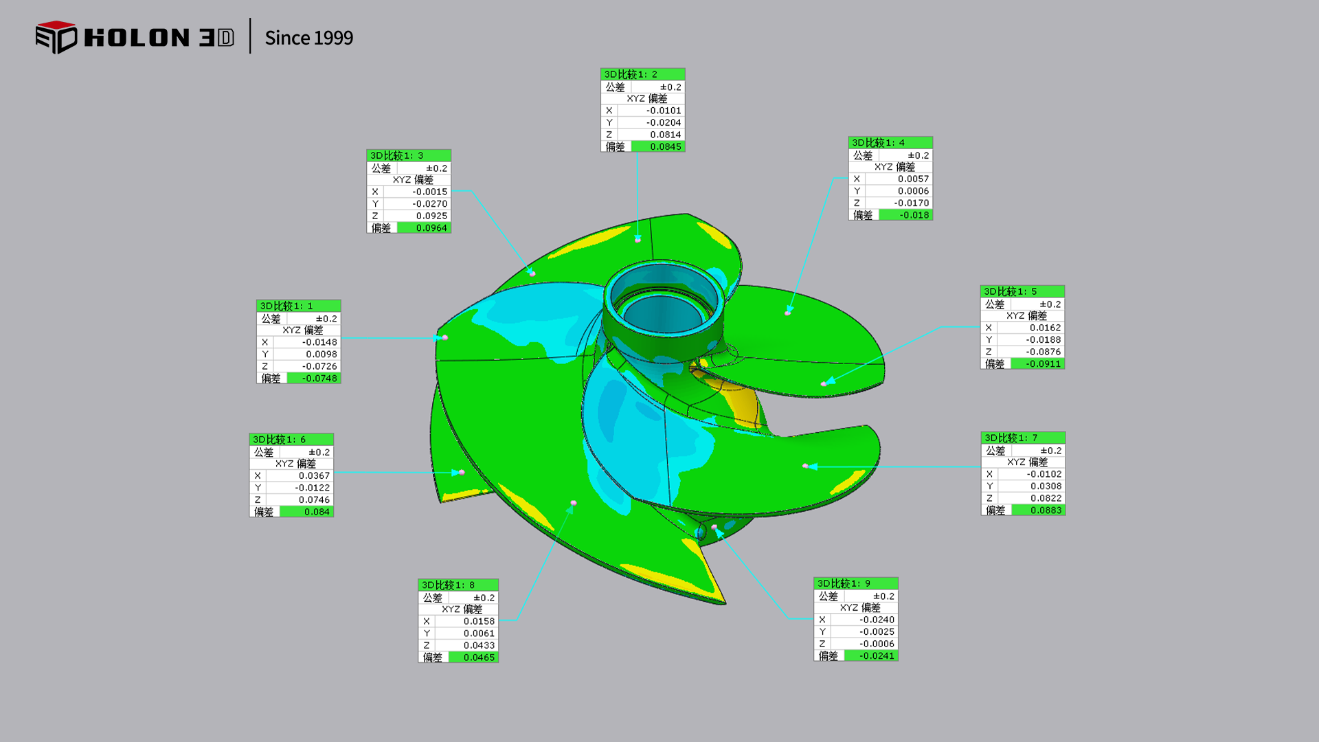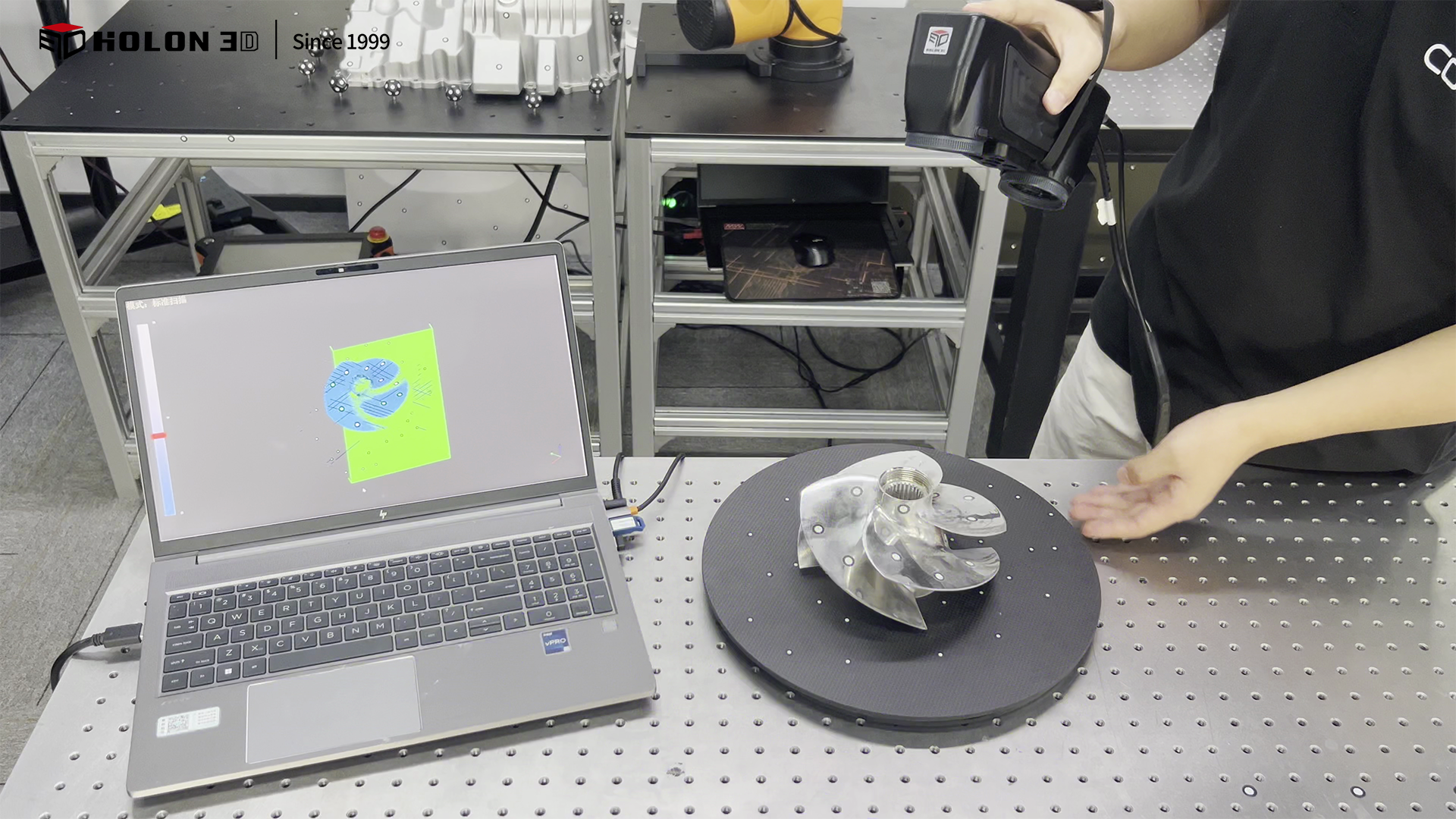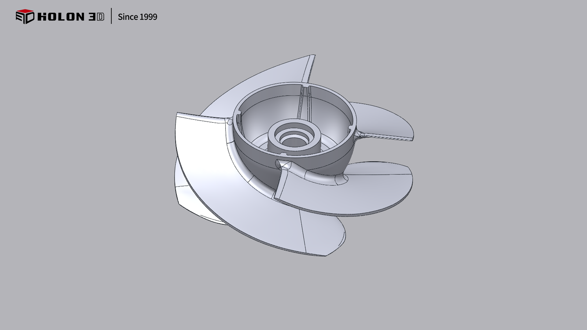 葉輪螺旋槳是摩托艇的核心動力部件,其葉片弧度、尺寸精度與整體結(jié)構(gòu)完整性直接決定航行速度與動力效率??蛻粜鑼υ撃ν型~輪螺旋槳進(jìn)行三維掃描,獲取精準(zhǔn)完整的三維數(shù)據(jù)以開展逆向建模,為產(chǎn)品復(fù)刻、性能優(yōu)化或備件生產(chǎn)提供可靠依據(jù)。由于螺旋槳表面存在反光特性,且葉片部位較薄,客戶對掃描精度與工件數(shù)據(jù)完整性要求極高,傳統(tǒng)測量方式難以滿足需求,因此選擇 HOLON 3D Smart 49 手持式全藍(lán)激光工業(yè)級三維掃描儀,為螺旋槳的數(shù)字化逆向建模提供高效精準(zhǔn)的技術(shù)支撐。