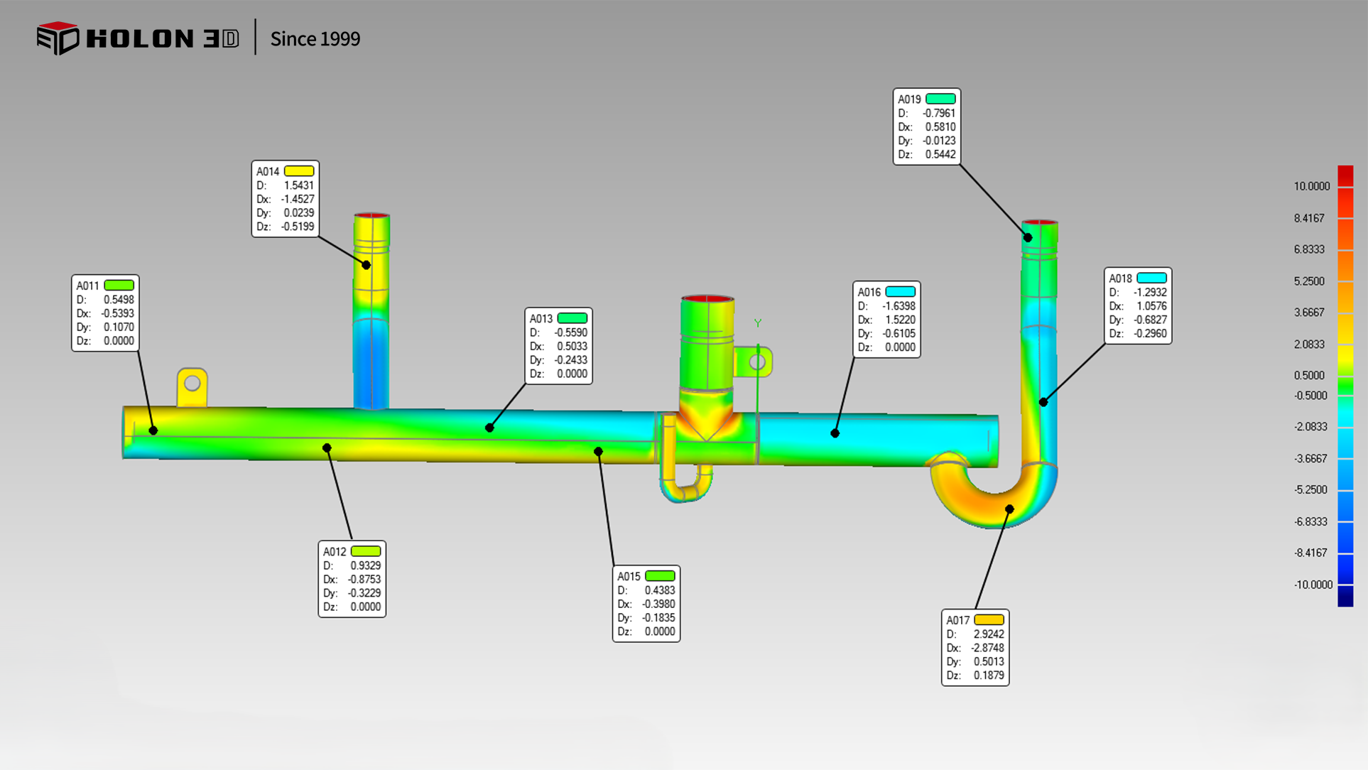 對(duì)于要解決測(cè)量空調(diào)管道尺寸與平行度問(wèn)題,我司工程師采用手持式三維掃描儀HOLON760,用的是藍(lán)色激光線(xiàn)。使用掃描儀快速全面掃描獲取工件高精度三維數(shù)據(jù),掃描用時(shí)短,速度極快,單機(jī)體積精度掃描高。有效解決了在掃描過(guò)程中遇到的問(wèn)題,無(wú)需做前期工作準(zhǔn)備,節(jié)省時(shí)間,提高工作效率。把掃描獲取數(shù)據(jù)導(dǎo)入到三維檢測(cè)軟件中與原始數(shù)模進(jìn)行對(duì)比分析。細(xì)節(jié)掃描效果很好,數(shù)據(jù)完整,精度高,客戶(hù)能通過(guò)分析對(duì)比直觀知道空調(diào)管道尺寸跟平行度存在的偏差??蛻?hù)很滿(mǎn)意掃描數(shù)據(jù),為后期的工作提供了數(shù)據(jù)參考。