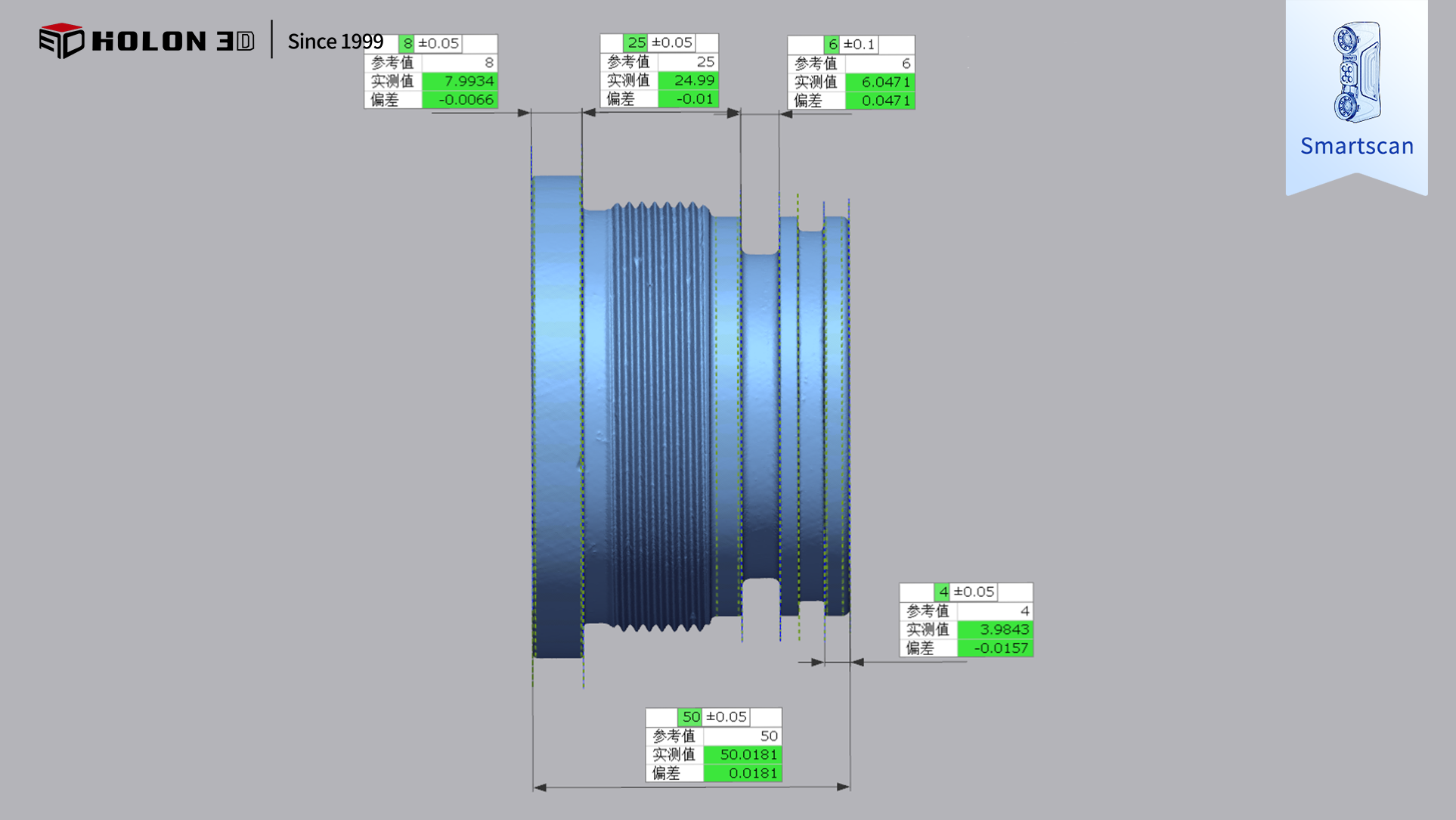 華朗三維采用HOLON 3D手持式三維掃描儀定制方案,通過(guò)深孔增強(qiáng)掃描模式與多頻動(dòng)態(tài)光源調(diào)節(jié)技術(shù)抑制鏡面反射干擾,無(wú)需噴涂即可穿透鏡面鍍層,精準(zhǔn)捕捉導(dǎo)向套深孔底部形貌及螺紋牙型細(xì)節(jié),實(shí)現(xiàn)超高精度數(shù)據(jù)采集;結(jié)合智能分析軟件自動(dòng)對(duì)齊CAD模型并生成3D色譜偏差圖,直接輸出關(guān)鍵尺寸誤差報(bào)告,全面滿足客戶對(duì)復(fù)雜結(jié)構(gòu)件全尺寸檢測(cè)的嚴(yán)苛要求,有效解決反光、深孔盲區(qū)及螺紋數(shù)據(jù)缺失等行業(yè)痛點(diǎn),顯著提升產(chǎn)品可靠性與產(chǎn)線質(zhì)檢效率。
