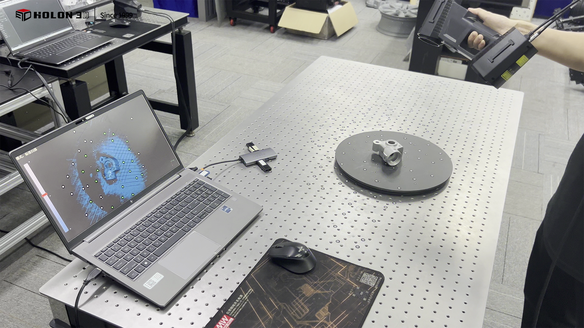 減速箱是氣動打包機(jī)的關(guān)鍵配件,其結(jié)構(gòu)精度直接影響設(shè)備的運行穩(wěn)定性與打包效率??蛻粜枰獙υ摐p速箱進(jìn)行三維數(shù)據(jù)采集,為后續(xù)的三維檢測、優(yōu)化設(shè)計及逆向設(shè)計等工作提供基礎(chǔ)數(shù)據(jù)。由于客戶對掃描的速度和精度有較高要求,傳統(tǒng)測量方式難以滿足,因此選擇 HOLON 3D model 49 手持式三維掃描儀,為減速箱的數(shù)字化處理及相關(guān)研發(fā)工作提供精準(zhǔn)的數(shù)據(jù)支持。