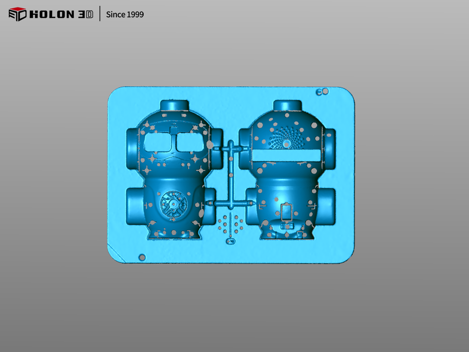 公仔模具是塑造公仔外形的核心工具,其表面的細節(jié)特征直接決定公仔產品的外觀精致度??蛻粜鑼υ撃>哌M行三維數(shù)據(jù)采集,通過逆向建模還原模具結構,為模具的修復、復刻或設計優(yōu)化提供依據(jù)。由于模具表面特征豐富且存在反光問題,同時客戶對掃描速度與精度有較高要求,傳統(tǒng)測量方式難以滿足需求,因此選擇 HOLON 3D smart 49 手持式全藍激光三維掃描儀,為模具的數(shù)字化逆向建模提供精準數(shù)據(jù)支撐。