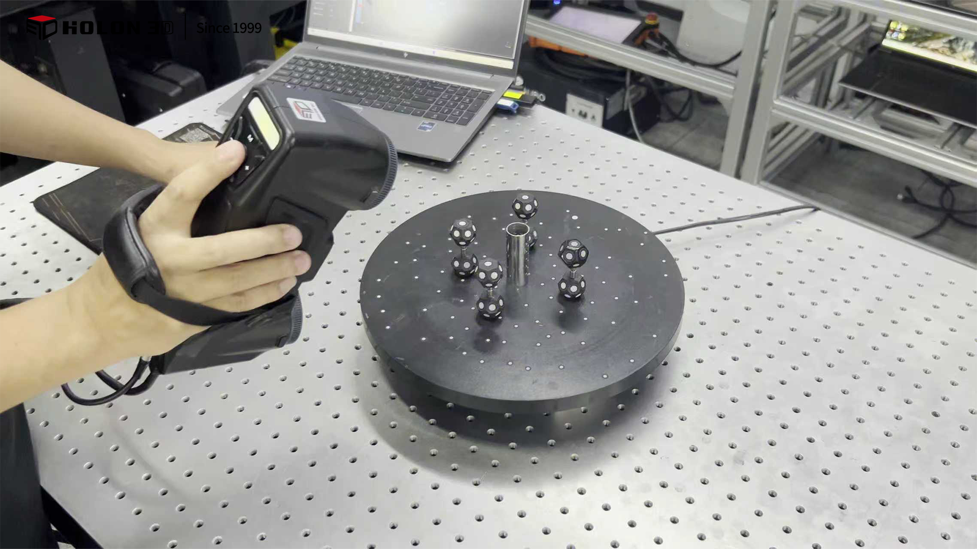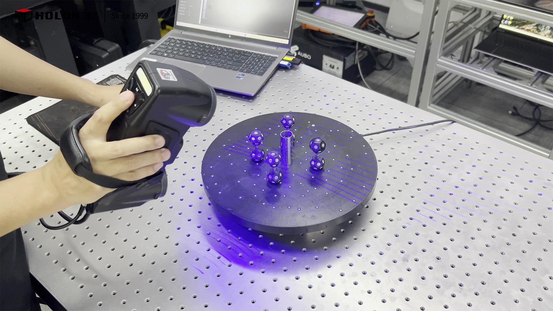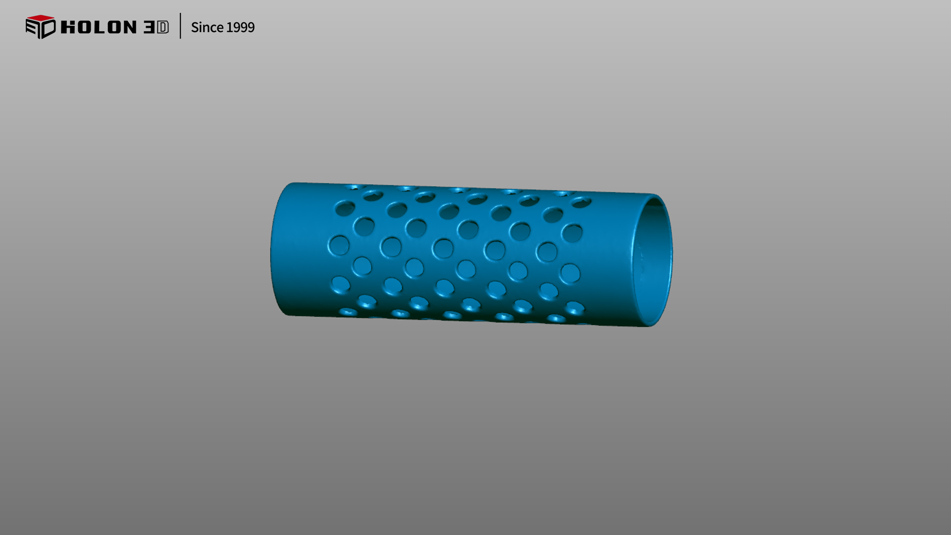 激光切割不銹鋼空心管作為工業(yè)裝配中的關(guān)鍵結(jié)構(gòu)件,其整體質(zhì)量與孔位精度直接影響后續(xù)裝配的適配性??蛻粜鑼υ摷す馇懈罟苓M(jìn)行三維掃描,獲取精準(zhǔn)三維數(shù)據(jù)以開展質(zhì)量檢測,核心驗(yàn)證管體整體形態(tài)是否合格、激光切割孔位的位置偏差是否在公差范圍內(nèi)。由于工件為不銹鋼材質(zhì)且表面反光強(qiáng)烈,同時(shí)分布著大量激光切割孔,客戶對掃描精度與工件數(shù)據(jù)完整性要求極高,傳統(tǒng)測量方式難以滿足需求,因此選擇 HOLON 3D Smart 49 手持式全藍(lán)激光工業(yè)級(jí)三維掃描儀,為激光切割管的質(zhì)量檢測提供可靠數(shù)字化支撐。