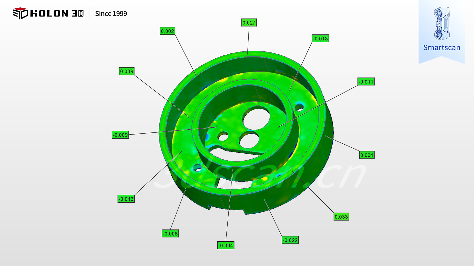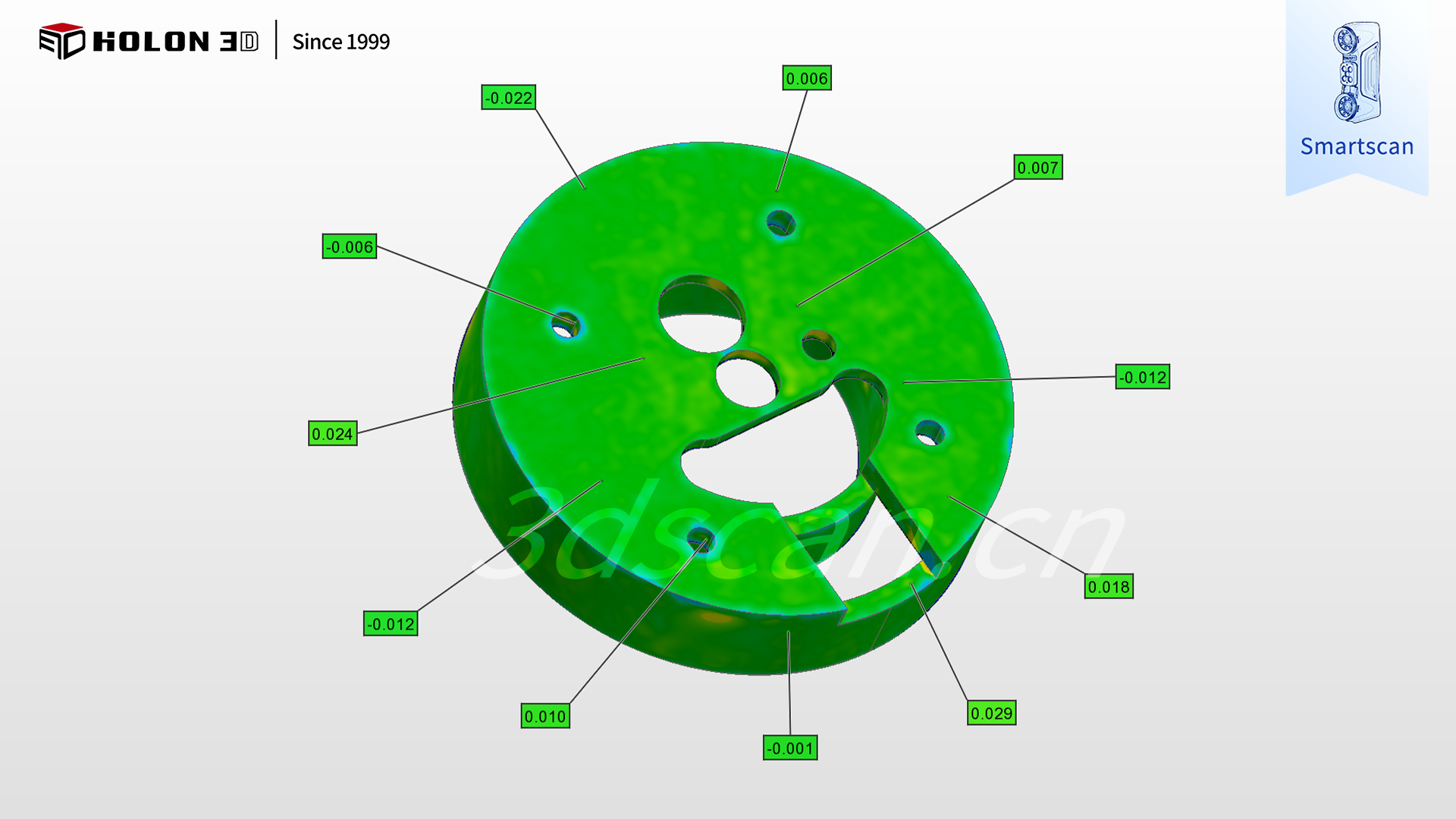 采用 HOLON3D Smart 49 掃描儀可針對性破解難題,其具備工業(yè)計量級精度,搭配全藍(lán)激光技術(shù),無需任何表面預(yù)處理即可穿透強反光干擾,精準(zhǔn)捕捉拋光件輪廓、邊緣及表面細(xì)節(jié)數(shù)據(jù);搭載四種掃描模式,可根據(jù)拋光件整體輪廓、細(xì)微特征等靈活切換,配合手持設(shè)計自由調(diào)整掃描角度,實現(xiàn)全區(qū)域無死角掃描;高速無接觸測量既避免了對拋光表面的損傷,又大幅提升檢測效率,且不受場景約束,僅需粘貼少量標(biāo)志點即可穩(wěn)定輸出高質(zhì)量數(shù)據(jù);掃描數(shù)據(jù)與原始模型比對可生成清晰三維檢測色譜圖,準(zhǔn)確量化誤差分布,科學(xué)判定合格性,完全契合客戶嚴(yán)苛需求,為金屬拋光件質(zhì)量管控與工藝優(yōu)化提供可靠支撐。