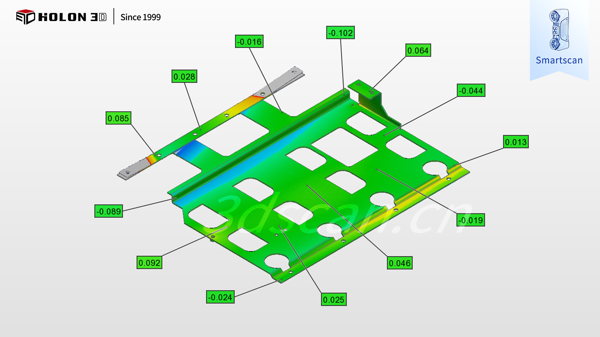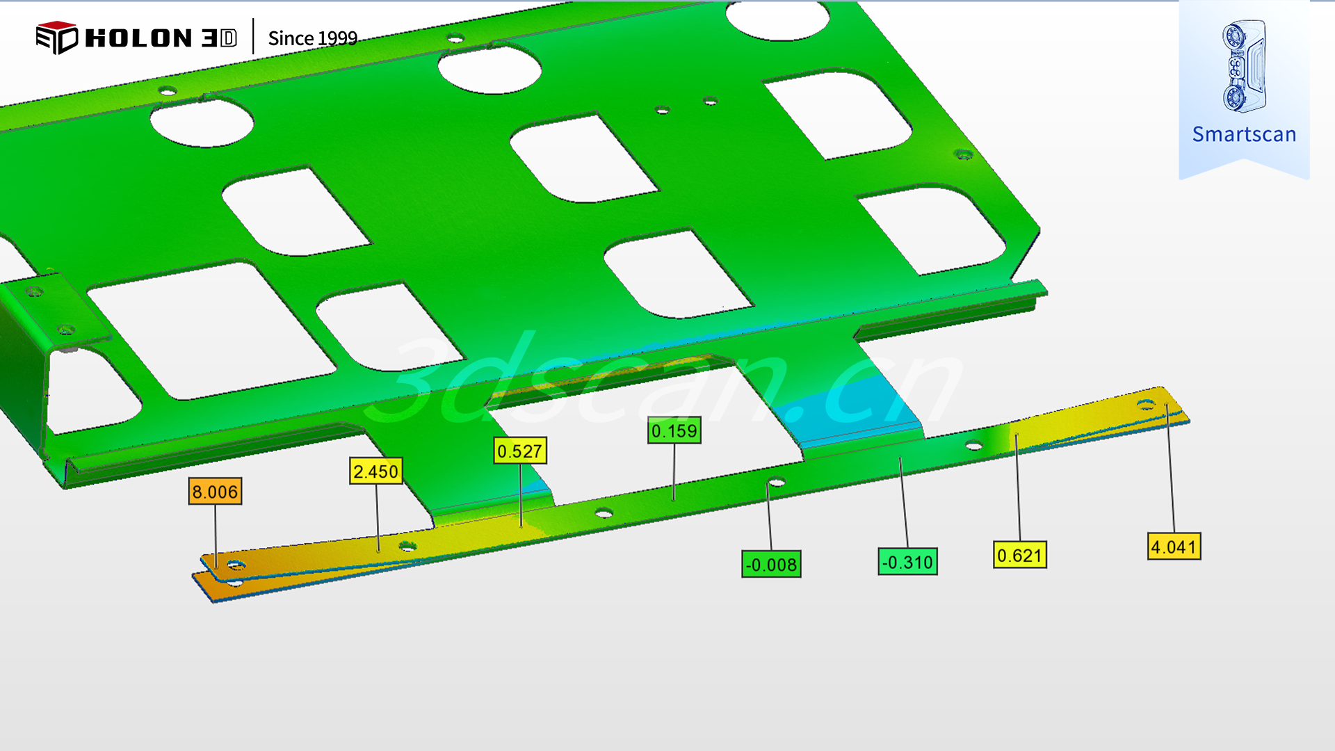 采用 HOLON3D Smart 49 掃描儀可針對性破解難題,其具備工業(yè)計量級精度,搭配全藍(lán)激光技術(shù),無需特殊預(yù)處理即可穿透反光干擾,精準(zhǔn)捕捉鈑金件輪廓及折彎細(xì)節(jié)數(shù)據(jù);搭載四種掃描模式,可根據(jù)鈑金件整體輪廓、細(xì)微折彎邊等特征靈活切換,配合手持設(shè)計自由調(diào)整角度,實現(xiàn)全區(qū)域無死角掃描;高速無接觸測量避免薄鈑金件變形損傷,不受場景約束,僅需粘貼少量標(biāo)志點(diǎn)即可穩(wěn)定輸出高質(zhì)量數(shù)據(jù),掃描數(shù)據(jù)與原始模型比對生成清晰色譜圖,準(zhǔn)確量化誤差,科學(xué)判定合格性,完全契合客戶需求,為鈑金件質(zhì)量管控與工藝優(yōu)化提供可靠支撐。