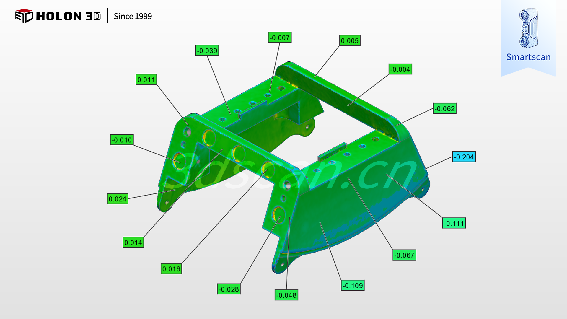 采用HOLON3D Smart 49掃描儀可針對性破解核心難題,其具備工業(yè)計量級精度,搭配全藍(lán)激光技術(shù),無需特殊預(yù)處理即可適配鋁制材質(zhì),穿透輕微反光干擾,精準(zhǔn)捕捉鑄件型腔、筋條等關(guān)鍵特征及表面細(xì)節(jié)數(shù)據(jù)。設(shè)備搭載四種掃描模式,可根據(jù)鑄件整體輪廓、細(xì)微結(jié)構(gòu)靈活切換,配合手持設(shè)計自由調(diào)整掃描角度,實現(xiàn)全區(qū)域無死角掃描。高速無接觸式測量避免工件損傷,不受場景約束,僅需粘貼少量標(biāo)志點即可穩(wěn)定輸出高密度點云數(shù)據(jù),掃描數(shù)據(jù)與原始模型比對生成清晰色譜圖,精準(zhǔn)量化誤差分布,科學(xué)判定鋁鑄件質(zhì)量合格性,完全契合客戶嚴(yán)苛需求,為鑄件質(zhì)量管控提供可靠支撐。