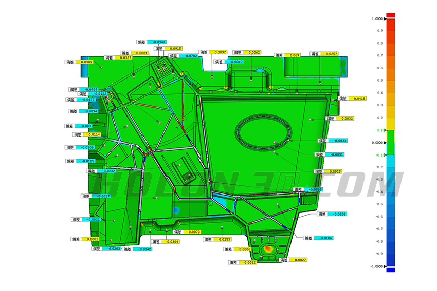 對于模具掃描的問題,華朗采用手持式三維掃描儀Model 29,先對其標志點進行掃描,獲取全局三維坐標定位,然后利用激光與標志點之間的的拼接獲取整體三維數(shù)據(jù)。然后利用對比軟件快速導出檢測報告圖,模具細節(jié)數(shù)據(jù)誤差一目了然。