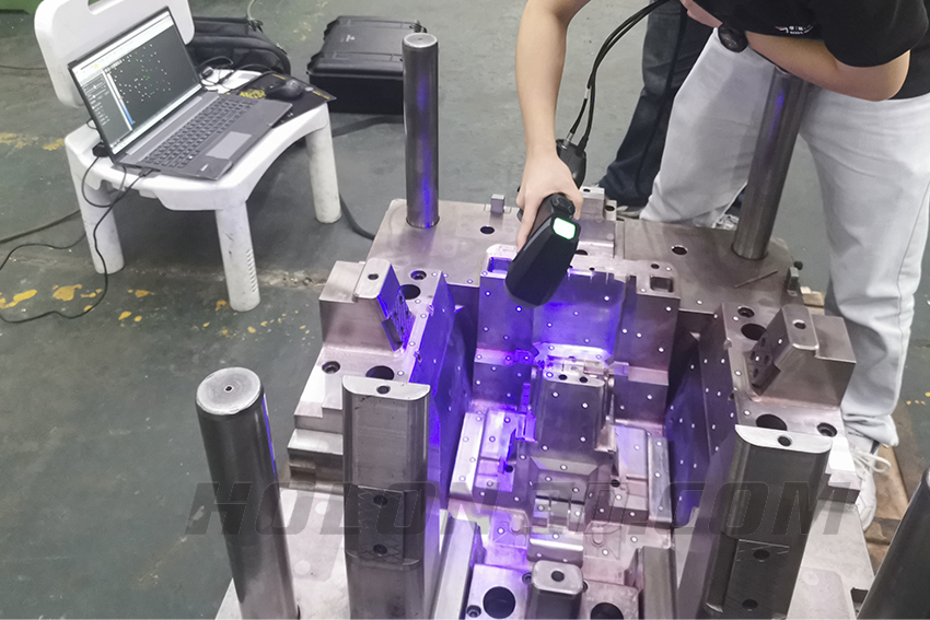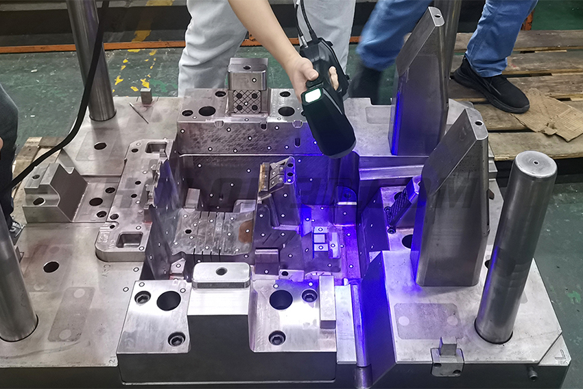 汽車模具有尺寸大、重量大、形面復雜的特點,隨著模具的越來愈精密化,對模具測量的精度要求也越來越高針對汽車模具制造中的加工與測量難題,千分尺以及三坐標等傳統(tǒng)的檢測方式大多應用在特征部位檢測上,對于大體積的汽車模具,在獲取完整曲面和和復雜輪廓外形上其檢測周期較長且精度不穩(wěn)定。而手持式三維掃描儀,通過非接觸式的測量方式,完美復刻表面特征同時兼具快速掃描的功能。