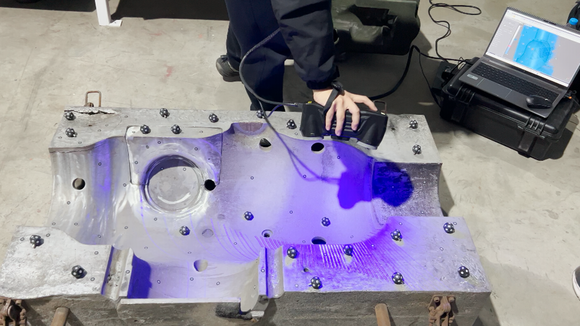 華朗三維工程師根據(jù)客戶工件的特征,采用手持式三維掃描儀Smart 49進行掃描演示。先使用大范圍掃描模式掃描模具整體輪廓,然后切換成單條激光線的深孔掃描模式,專門掃描深孔位置,精準捕捉孔內(nèi)。掃描儀精度高達0.02mm。掃描儀體型較小,操作簡單,可以實時成像,掃描完成的數(shù)據(jù)導(dǎo)入檢測軟件可以快速導(dǎo)出PDF檢測報告。