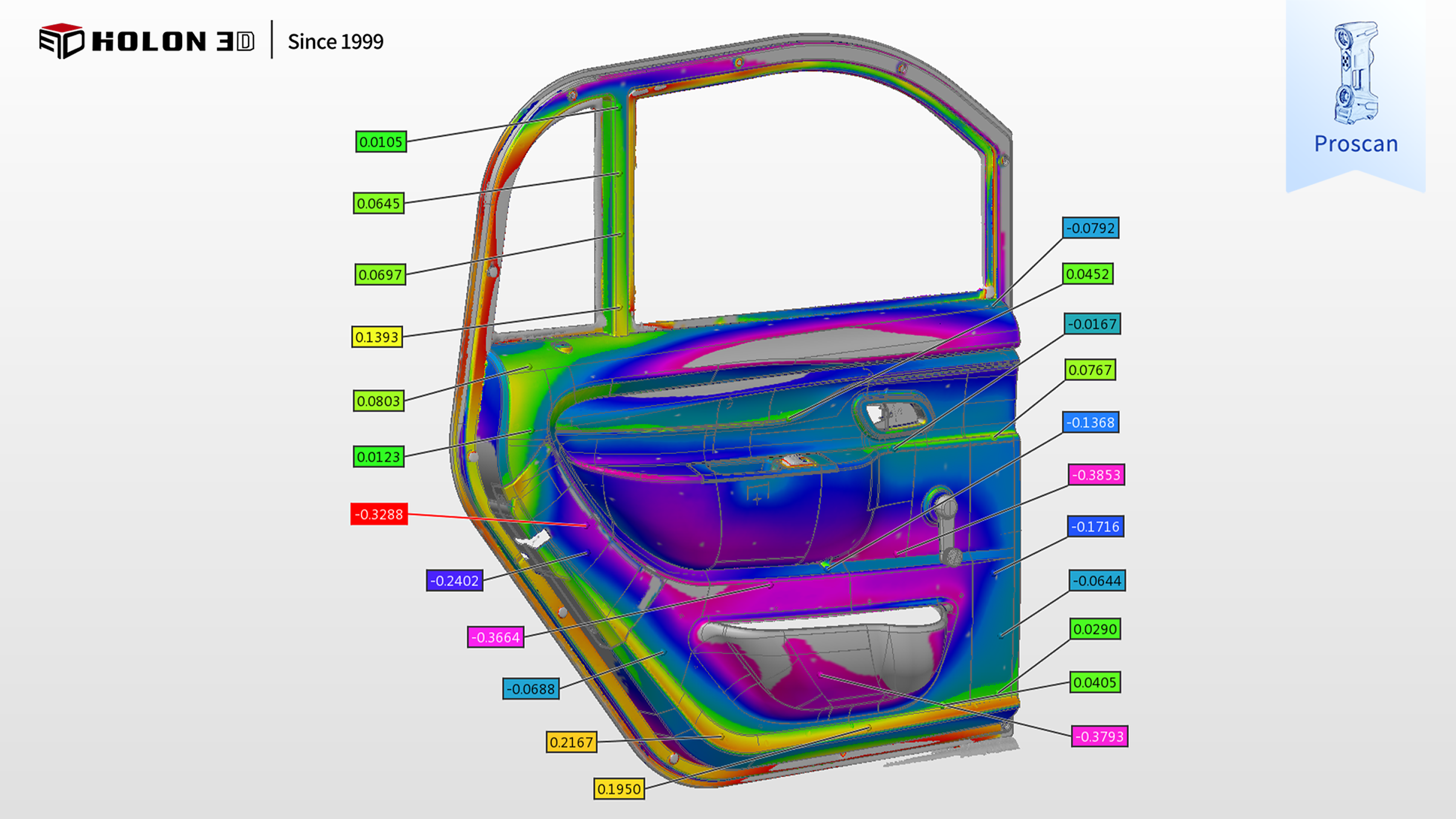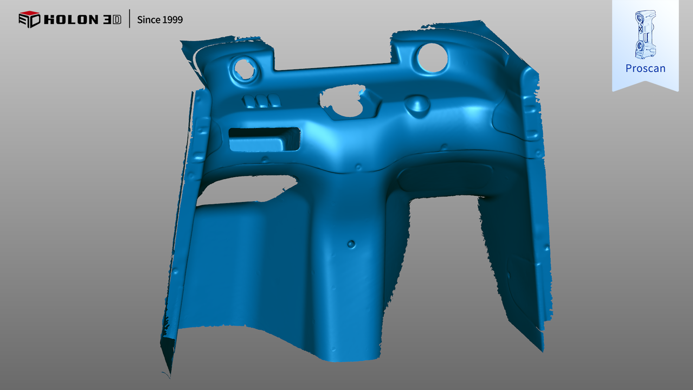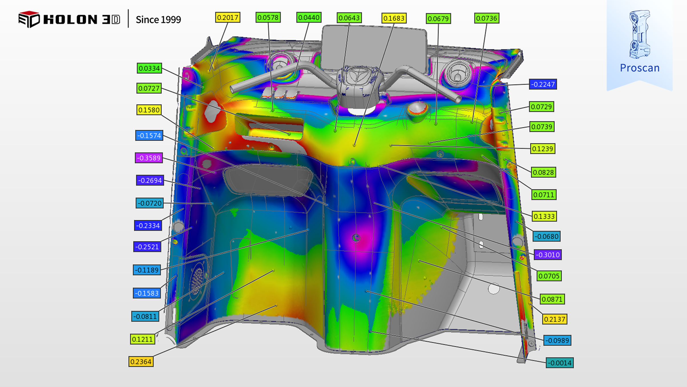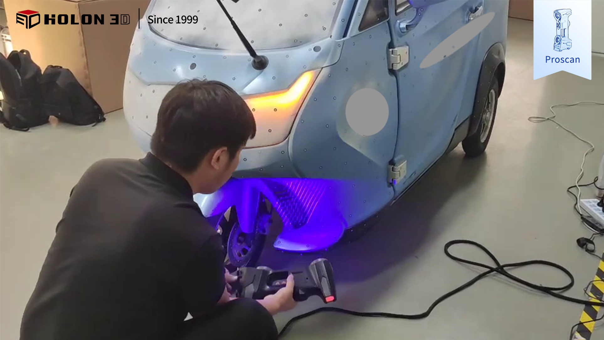HOLON工程師通過Proscan手持式三維掃描儀突破檢測瓶頸:設(shè)備搭載調(diào)光,無懼深色,適配金屬與塑料等多種材質(zhì),消除高反光干擾,完整獲取車架、輪胎及焊接點數(shù)據(jù);手持式設(shè)計可靈活深入車體狹小空間,以0.02mm精度捕捉隱蔽形變;掃描數(shù)據(jù)經(jīng)智能分析系統(tǒng)與CAD模型智能對齊,生成三維偏差色譜圖,直觀呈現(xiàn)車架彎曲度、軸距偏移等多項參數(shù),并輸出檢測對比報告,為工藝優(yōu)化提供精準(zhǔn)決策支持。