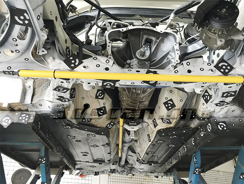 華朗三維掃描儀-貼好標(biāo)志點(diǎn)、編碼點(diǎn)與安放好靶桿的賽車底盤