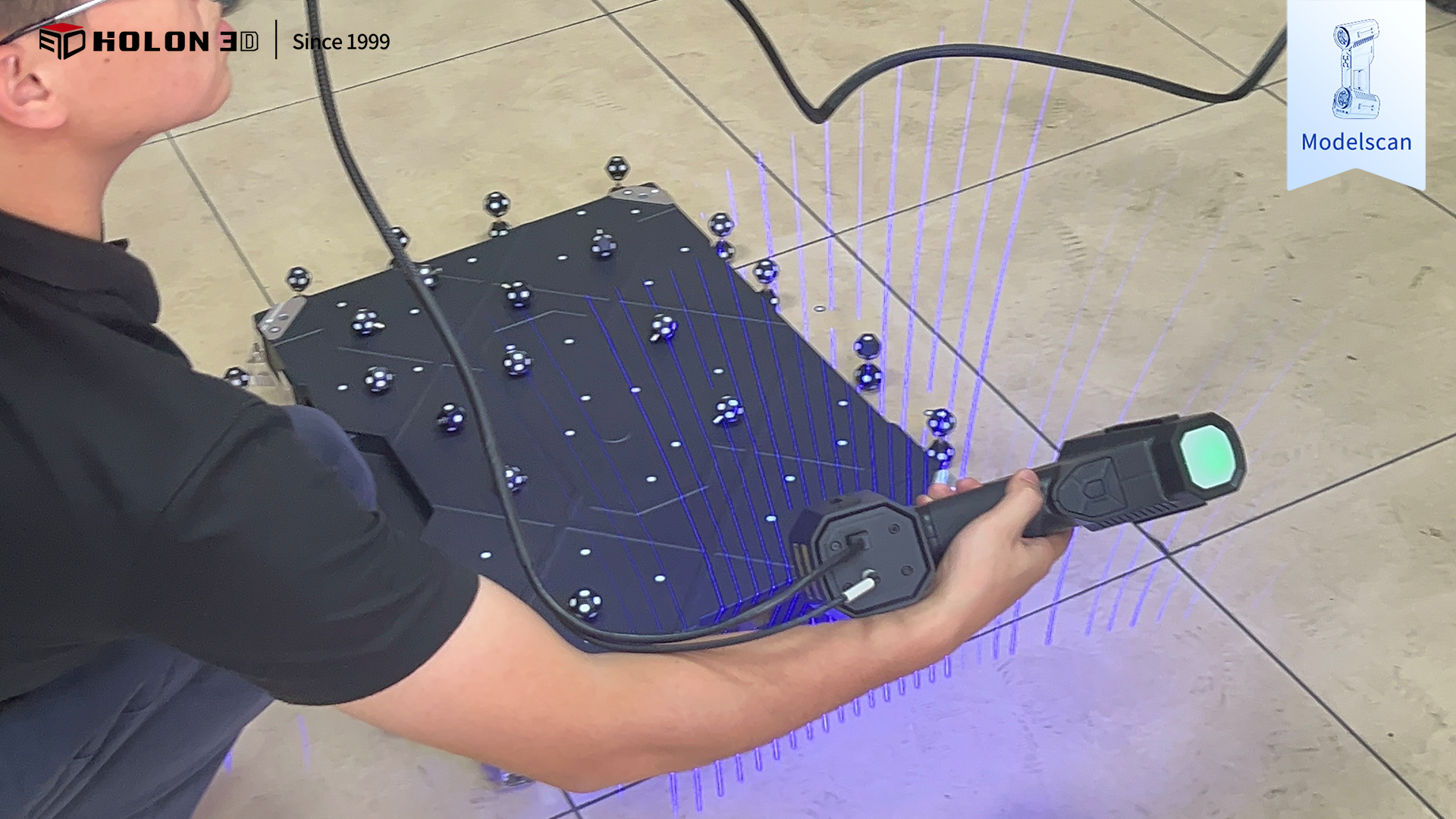 電池包組裝外殼是保障電池組安全裝配與穩(wěn)定運(yùn)行的核心部件,其外形輪廓、安裝位精度直接影響電池包裝配適配性與防護(hù)性能。客戶(hù)需通過(guò)三維掃描獲取外殼高精度完整數(shù)據(jù),與原始模型比對(duì)生成三維檢測(cè)色譜圖,量化誤差以判斷加工是否合格。因外殼整體呈黑色、安裝位較多,客戶(hù)對(duì)掃描精度與細(xì)節(jié)還原度要求嚴(yán)苛,傳統(tǒng)測(cè)量方式難以滿足,故選擇 HOLON 3D Model 49 手持式全藍(lán)激光工業(yè)級(jí)三維掃描儀提供數(shù)字化檢測(cè)方案。