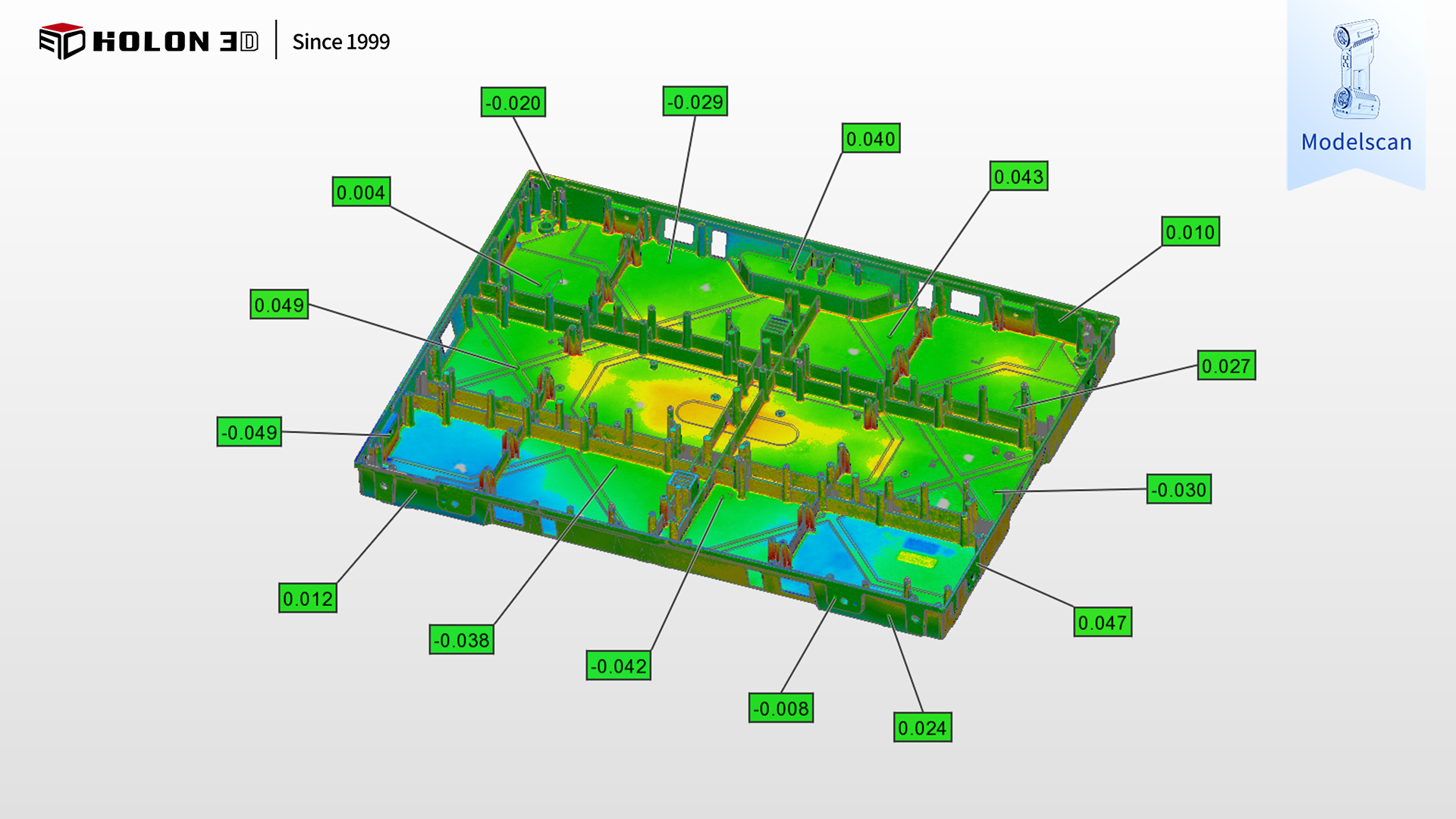 采用 HOLON 3D Model 49 掃描儀可針對(duì)性破解難題,其具備工業(yè)計(jì)量級(jí)精度,搭配全藍(lán)激光技術(shù),無(wú)需特殊預(yù)處理即可穿透黑色表面吸光干擾,精準(zhǔn)捕捉外殼輪廓及安裝位細(xì)節(jié)數(shù)據(jù);搭載四種掃描模式,可根據(jù)外殼整體輪廓、安裝位細(xì)微結(jié)構(gòu)等特征靈活切換,配合手持設(shè)計(jì)自由調(diào)整角度,輕松覆蓋安裝位內(nèi)側(cè)等隱蔽區(qū)域,實(shí)現(xiàn)全區(qū)域無(wú)死角掃描;高速無(wú)接觸測(cè)量避免外殼損傷,不受場(chǎng)景約束,僅需粘貼少量標(biāo)志點(diǎn)即可穩(wěn)定輸出高質(zhì)量數(shù)據(jù),掃描數(shù)據(jù)與原始模型比對(duì)生成清晰色譜圖,準(zhǔn)確量化誤差,科學(xué)判定合格性,完全契合客戶(hù)需求,為外殼質(zhì)量管控與工藝優(yōu)化提供可靠支撐。