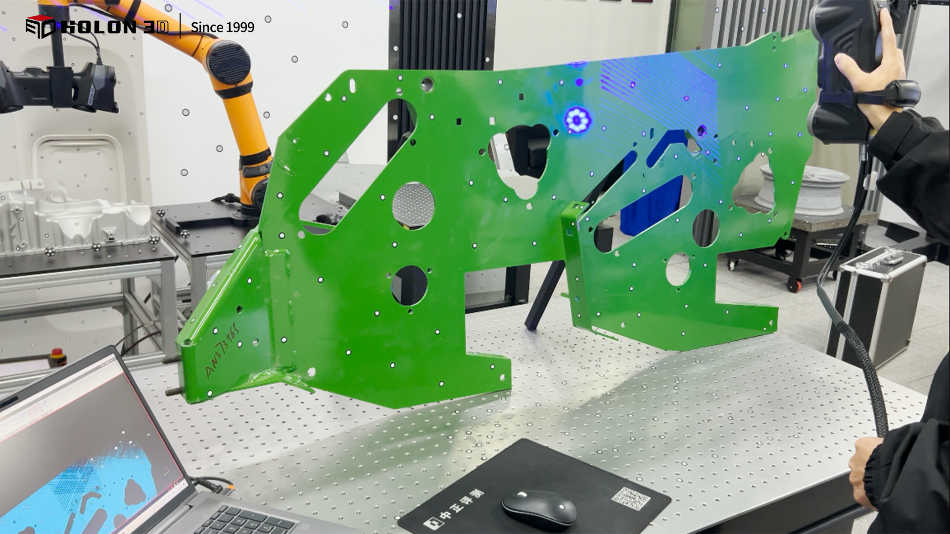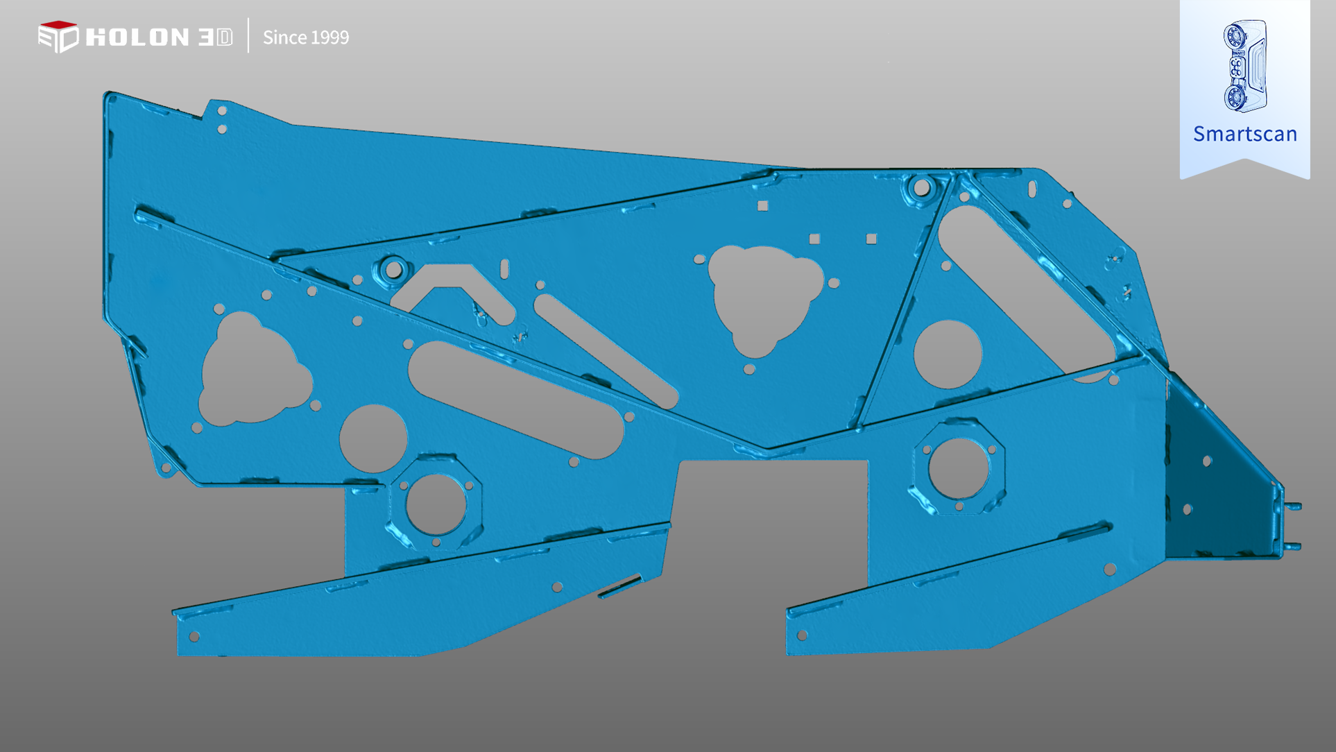 針對上述問題,HOLON 3D采用工業(yè)級三維掃描儀Smartscan 49進行全尺寸檢測:基于420萬點/秒的超高速掃描技術(shù),10分鐘內(nèi)完成鈑金件完整數(shù)據(jù)采集,0.02mm精度精準還原鈑金件形態(tài)及所有孔位三維坐標。設(shè)備通過激光與光柵多模式融合,自動捕捉隱藏孔及復(fù)雜折彎特征,利用對比軟件直接生成孔位偏移矢量圖,完美解決客戶的問題。