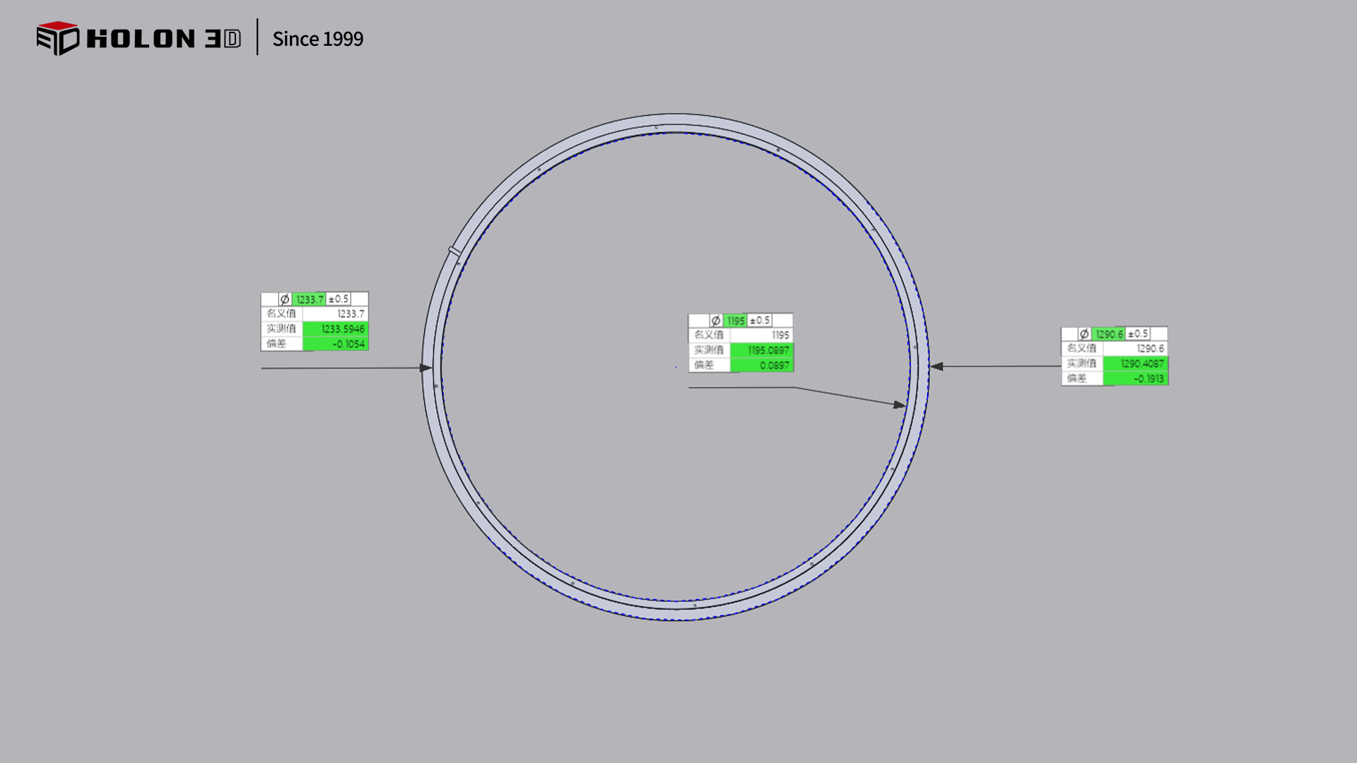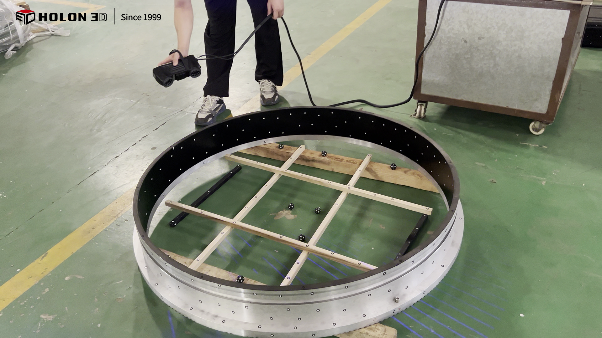直徑 1.3 米的圓形工件作為工業(yè)生產(chǎn)中常見的大型精密部件,其整體形態(tài)精度與尺寸公差直接影響后續(xù)裝配適配性與設(shè)備運行穩(wěn)定性。客戶需對該圓形工件進行三維掃描,獲取高精度、完整的三維數(shù)據(jù),通過與原始模型比對生成三維檢測色譜圖,借助色譜圖直觀量化誤差分布,以此判斷工件是否合格。由于工件尺寸較大且客戶對掃描精度、數(shù)據(jù)完整性要求極高,同時需適配客戶現(xiàn)場的檢測場景,傳統(tǒng)測量方式難以滿足需求,因此選擇 HOLON 3D Smart 49 手持式全藍激光工業(yè)級三維掃描儀,為圓形工件的精準質(zhì)量檢測提供可靠數(shù)字化支撐。