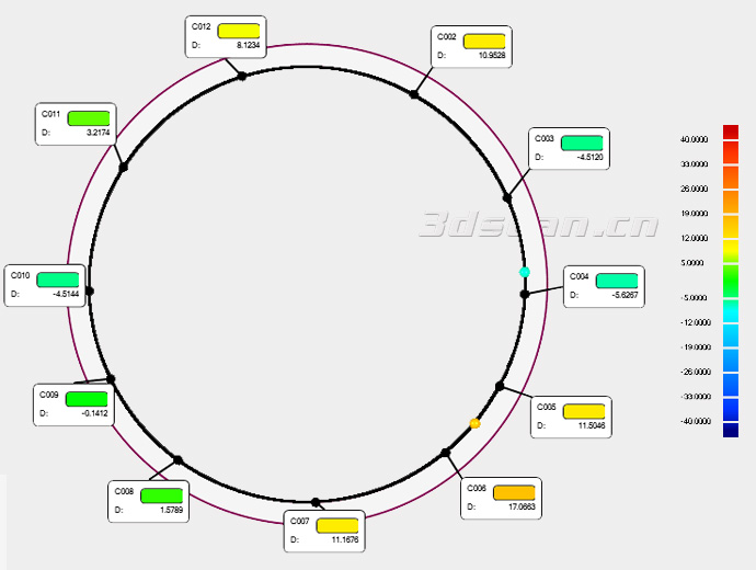 2.超大型鍛造件體積大,直徑10米,掃描此大型鍛造件必須使用大幅面的三維掃描儀進(jìn)行掃描,使用其它三維掃描儀,掃描時(shí)間較長(zhǎng)、精度低、掃描數(shù)據(jù)量大、其掃描數(shù)據(jù)最終無法進(jìn)行完整拼接。